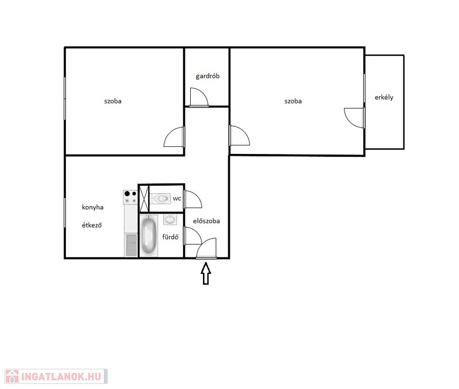 - 2 szoba, gardrób, előszoba, konyha, fürdőszoba, WC, erkély, pince